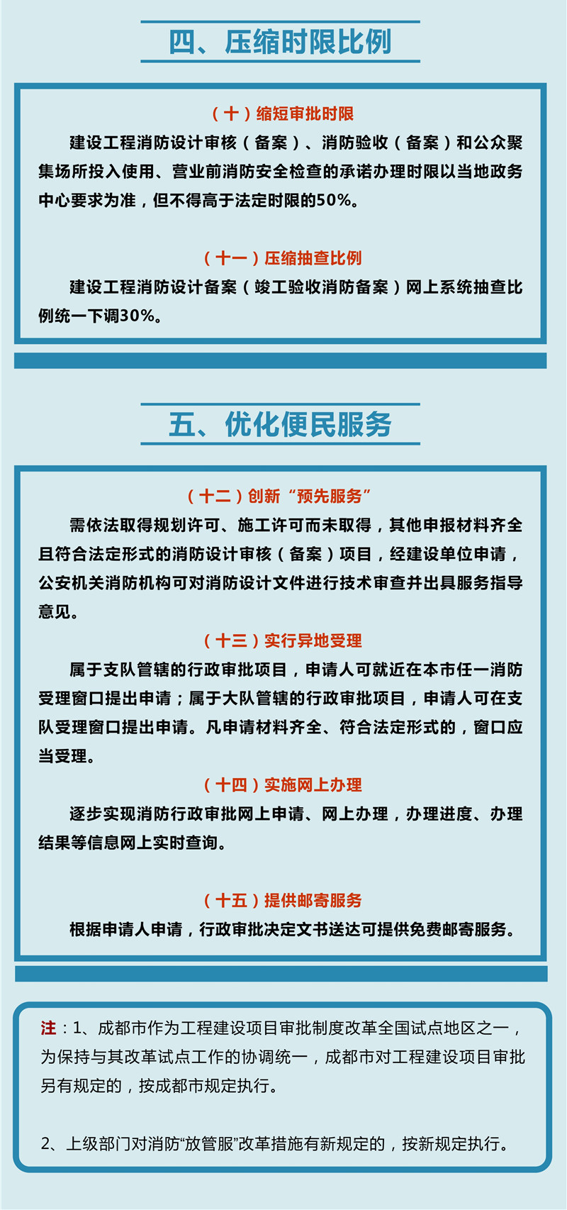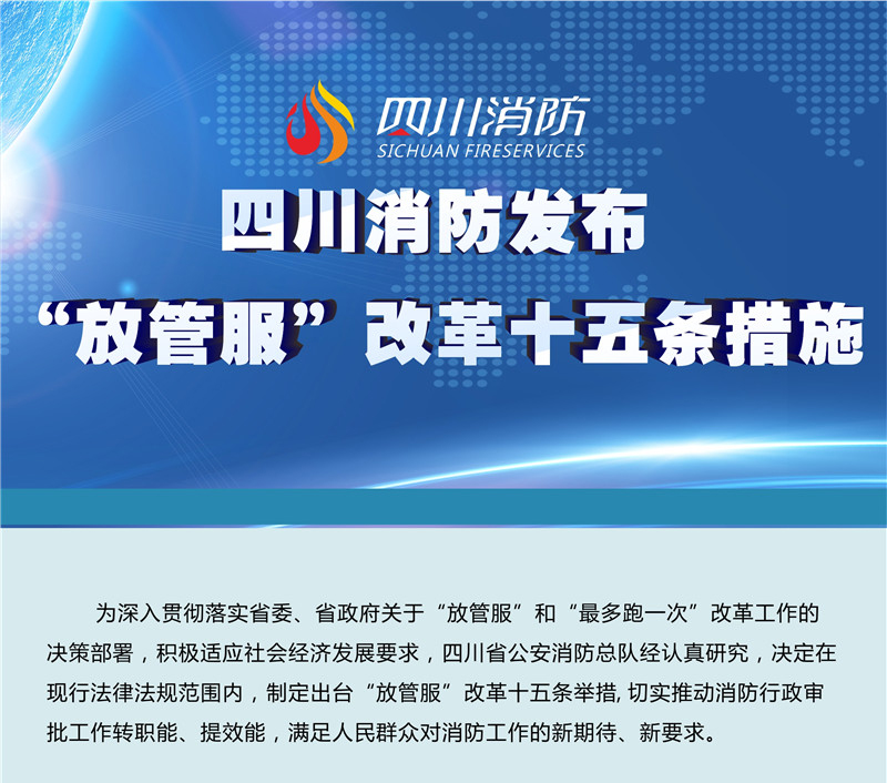 为深入贯彻落实四川省委、省政府关于“放管服”改革工作的决策部署,积极适应社会经济发展要求,全面深化消防行政领域“放管服”改革,提高消防行政服务能力,四川省公安消防总队结合实际,于8月26日制定出台《四川消防“放管服”改革十五条措施》(以下简称《措施》)。从“取消部分审批、下放审批权限、简化申报材料、压缩时限比例、优化便民服务”五个方面进一步改革消防行政审批工作,切实回应群众和企业的新期待、新要求。同时,制定一系列改革配套制度,规范工作规程和标准,确保公共消防安全监管能力大提升,服务保障大优化。