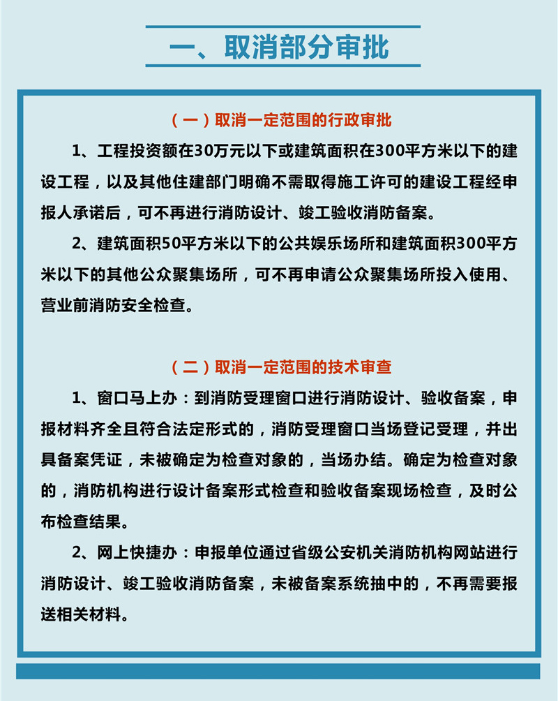 其次是“取消一定范围的技术审查”。《措施》中明确将实行“窗口马上办”和“网上快捷办”相结合,到消防受理窗口进行消防设计、验收备案,申报材料齐全且符合法定形式的,消防受理窗口当场登记受理,并出具备案凭证,未被确定为检查对象的,当场办结。确定为检查对象的,消防机构进行设计备案形式检查和验收备案现场检查,及时公布检查结果,做到“最多跑一次”;申报单位还可以通过省级公安机关消防机构网站进行消防设计、竣工验收消防备案。