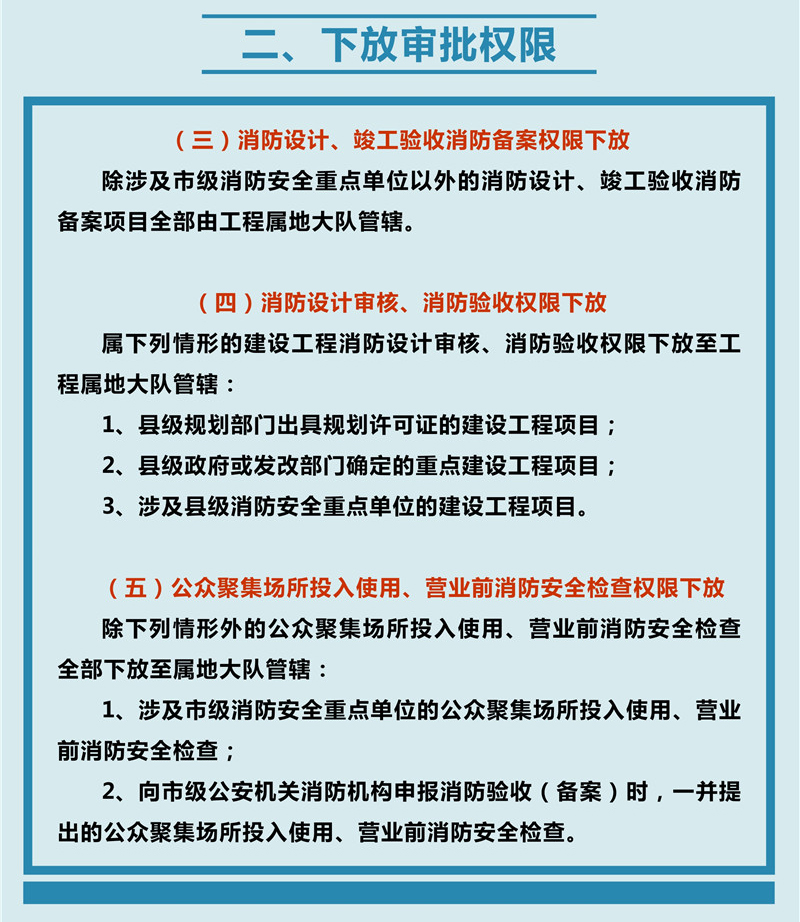 其次,是消防设计审核、消防验收权限的下放。由县(市、区)级规划部门出具规划许可证的、县(市、区)级发改部门确定为重点建设项目的和涉及县级消防安全重点单位的工程项目消防设计审核、消防验收权限下放至工程属地大队管辖。