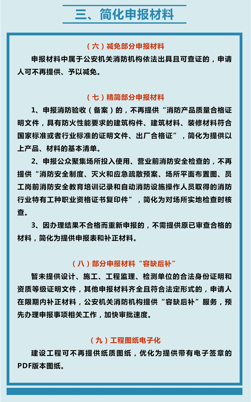 《措施》中明确,对于行政审批服务中的申报材料,能够通过内部自查、主动查询或现场核查到的,不再要求群众必须提供纸质证明材料,避免办事群众来回跑。在精简部分申报材料方面,建设工程申报消防验收和消防验收备案,将不再需要提供消防产品质量合格证明文件等3项材料,简化为提供以上产品、材料的基本清单,交由消防部门通过内部核实、部门查询等方式核实。场所“开检”将不再需要消防安全制度等5项材料,简化为对场所实地检查时进行核查。在提交材料时,因办理结果不合格而重新申报的,不需提供原已审查合格的资料,简化为提供申报表和补正材料。